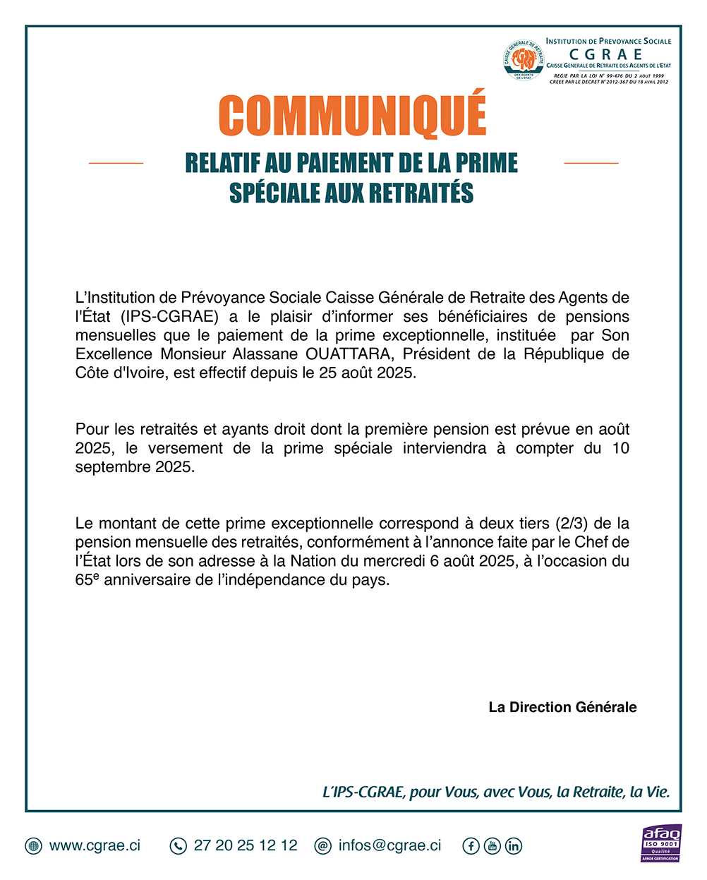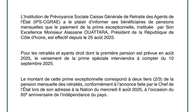 Communiqué : L’IPS-CGREA donne des informations sur la disponibilité de la prime exceptionnelle des retraités ACTUALITEEVENEMENT Par admin Dernière mise à jour Août 30, 2025 22 Partager Listen to this article Communiqué CommuniquéIPS-CGRAEPrime exceptionnelle des retraités 22 Partager
