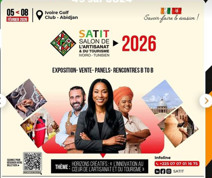 Afin de dynamiser les excellentes relations qui existent entre la Côte d’Ivoire et la Tunisie, en ce début d’année 2026, les deux pays ont décidé de donner un nouveau souffle à cette coopération à travers l’organisation d’un Salon dénommé le Salon de l’artisanat et du tourisme ivoiro-tunisien (SATIT). Ainsi, le SATIT 2026 qui est à sa première édition est prévu du 5 au 8 février 2026 à Ivoire Golf Club, à Abidjan dans la commune du Plateau. Il a pour thème « Horizons créatifs : l’innovation au cœur de l’artisanat et du tourisme. »